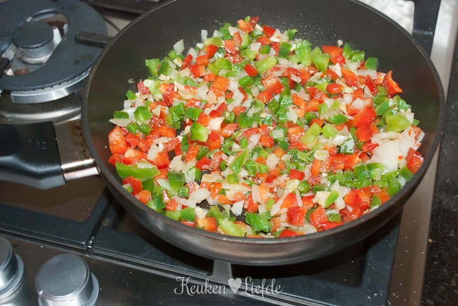 - 2 paprika’s (groen en rood), in kleine blokjes gesneden