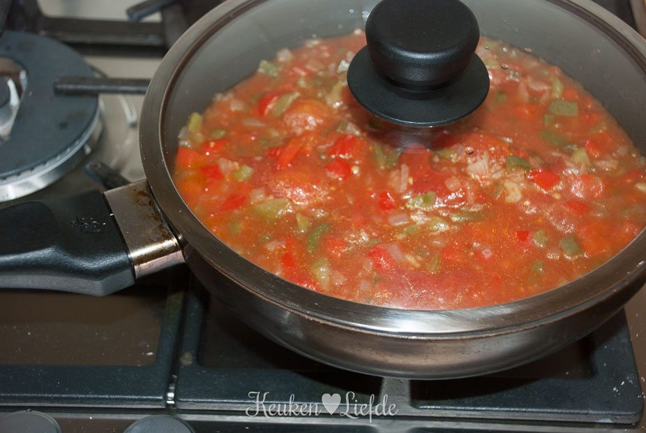 Rooster de komijnzaadjes in een droge hapjespan, totdat ze beginnen te geuren. Voeg een scheut olijfolie toe en fruit de ui en knoflook op laag vuur totdat ze zacht zijn. Voeg de paprika’s en peper toe en kruid met zout en peper. Bak circa 15 minuten verder op laag vuur totdat de paprika’s zacht zijn. Voeg het blik tomaten toe. Vul het lege tomatenblik voor 1/3 met water, schud even om en voeg dit toe aan de saus. Breng de saus op smaak met een snufje suiker en wat zout en peper. Doe de deksel op de pan en laat de saus circa 10 minuten zachtjes pruttelen.