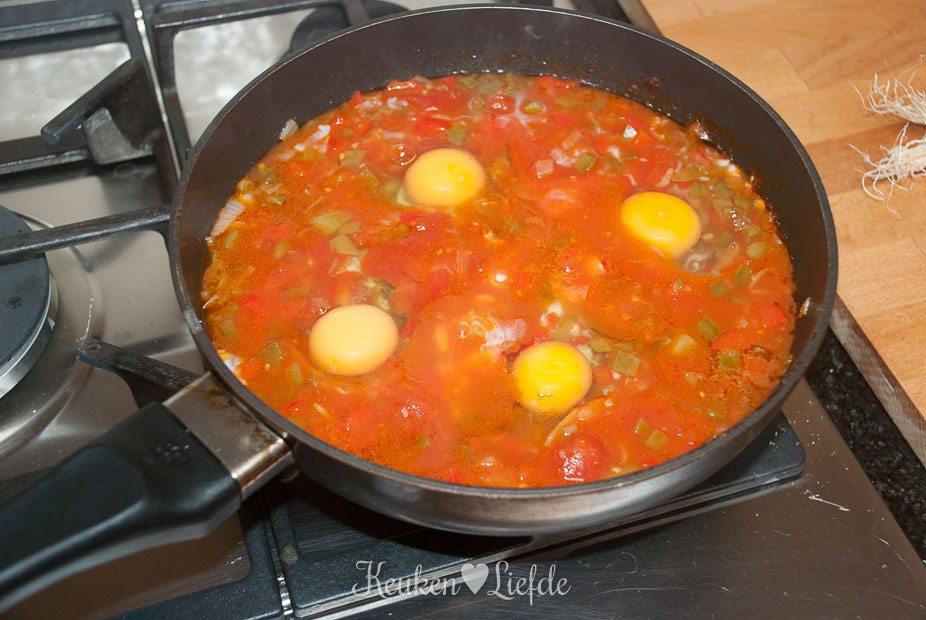 Maak vier holletjes in de tomatensaus en breek de eieren erin. Doe de deksel op de pan en pocheer de eieren in de tomatensaus gaar.