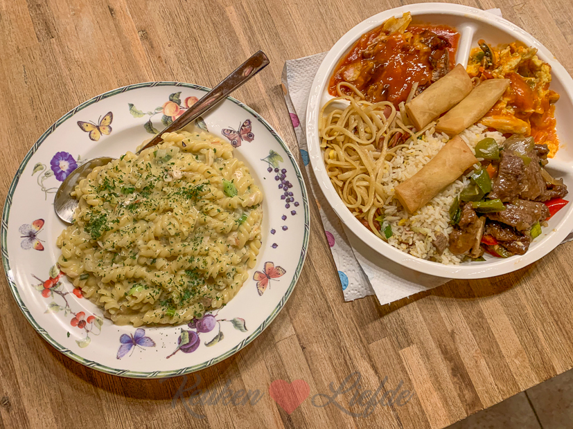 Ik zit ondertussen op kantoor om recepten uit te schrijven voor de website en het nieuwe KL-kookboek en foto’s te bewerken. ’s Avonds eet Johan nog een keer Chinees en ik maak een bordje pasta voor mezelf. Er ligt namelijk al heel lang een zakje pasta carbonara van Knorr in de kelder en daar had ik zo’n zin in. Hallo guilty pleasure! ✋?Om me wat minder schuldig te voelen voeg ik altijd verse ingrediënten toe… ? Het Chinese eten dat over was ging in de vriezer.