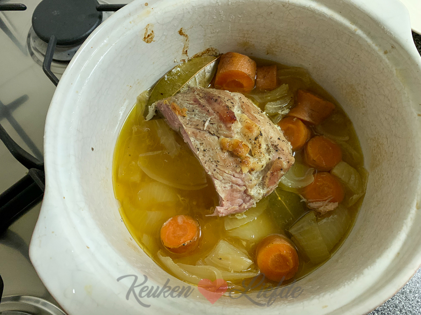 ’s Avonds is het kliekjestijd! Hutspot met een gehaktbal en een stuk rookworst uit de vriezer met nog een kliekje Belgisch stoofvlees. Ziet er niet uit zo’n bord smurrie, maar smaken doet het!