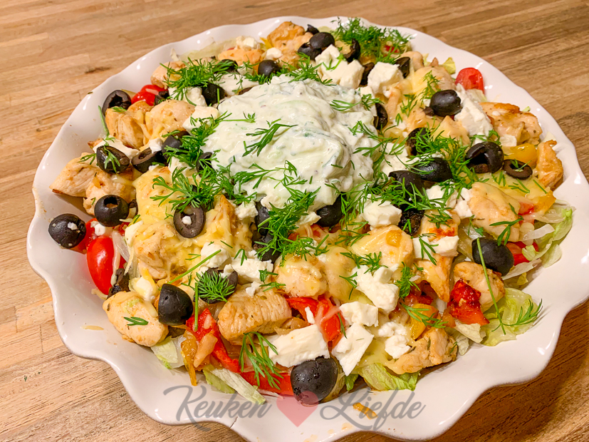 ’s Avonds kookt Johan en dat is feest! Op het menu staat een Griekse kapsalon: een ovenschaal met laagje ovenaardappeltjes (wij maken ovenaardappels altijd in de braadslee met dikke bodem met knoflooktenen in de schil, een flinke scheut olijfolie en zeezout uit de molen, dan worden ze goudbruin en knapperig vanbuiten en zacht vanbinnen!), gebakken kipfilet met ui en paprika, rauwkost (witte kool, ijsbergsla en zoete ui), geraspte kaas, feta, olijven en tomaatjes die kort gegratineerd wordt in de oven. Dan afmaken met zelfgemaakte tzatziki, verse dille en smullen maar. Geloof me jongens en meisjes, dit wil je maken. Gruwelijk lekker!