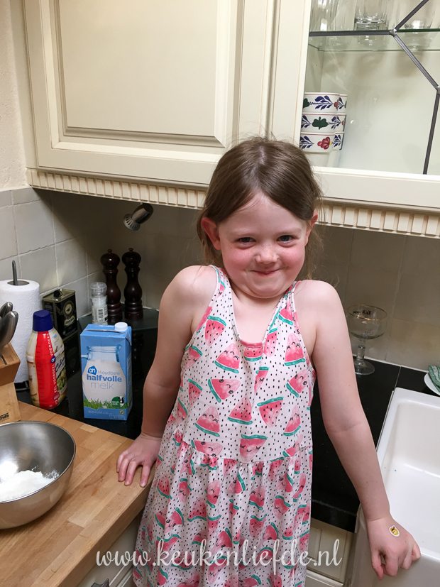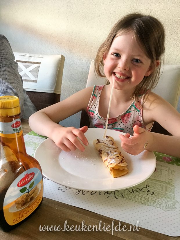 Iedereen eet vanavond iets anders. Ella-Marie mag zelf een klein beetje pannenkoekbeslag maken en daar bak ik vervolgens een kaaspannenkoek en een gewone pannenkoek van.