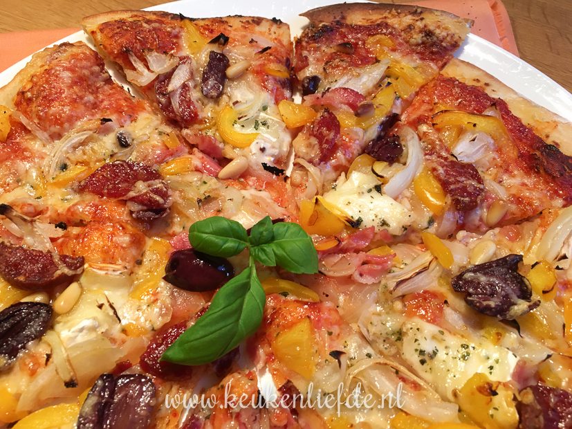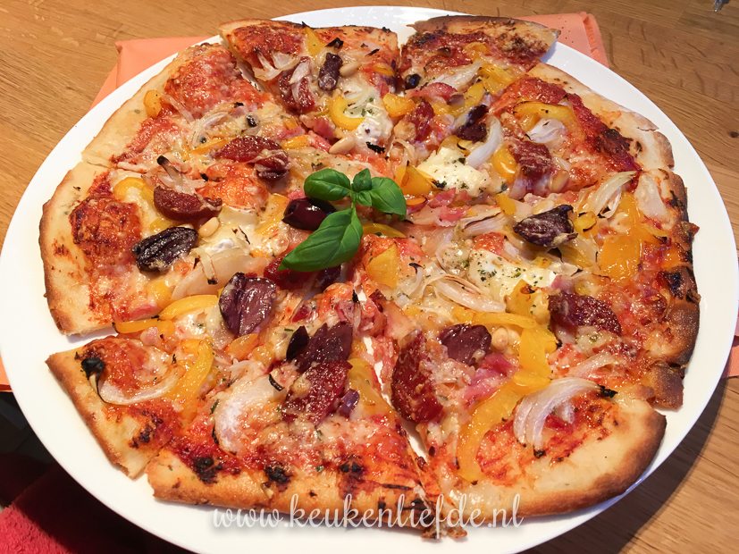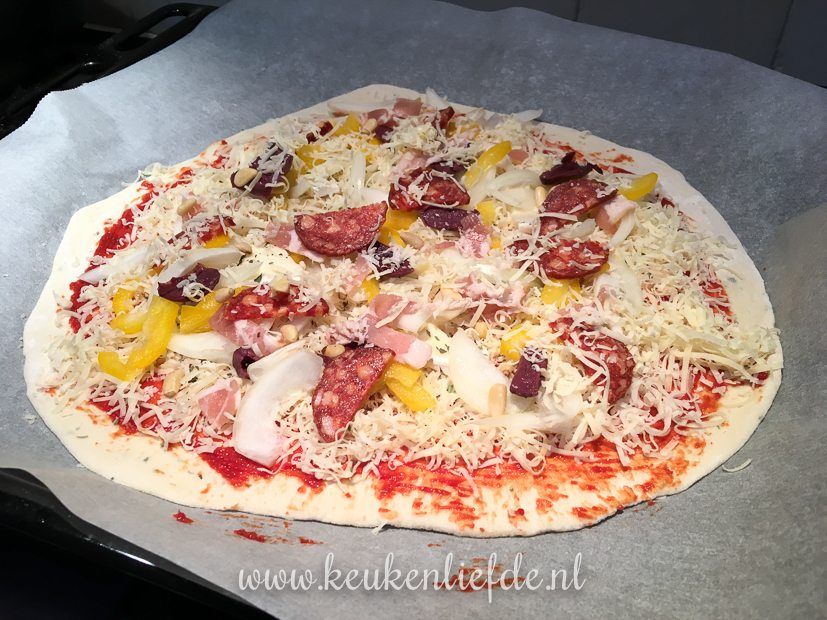Met een bolletje zelfgemaakt pizzadeeg dat nog in de vriezer ligt, maar ik een lekkere pizza voor mezelf. Iedereen blij!
