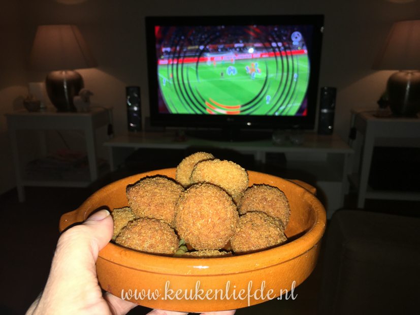 ’s Avonds als El op bed ligt kijken Johan en ik voetbal (hadden we beter niet kunnen doen) en eten we een paar ovensnacks: bami- en kaashapjes en bitterballen. Mmmm…