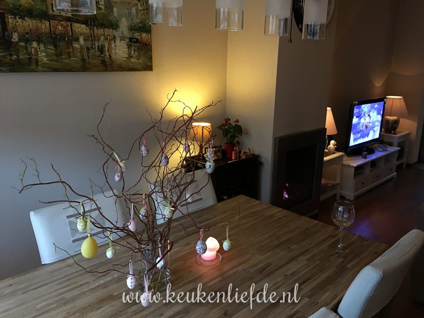 Terwijl de kip lekker staat te stoven, hang ik eieren in de paastakken. Gezelligheid!