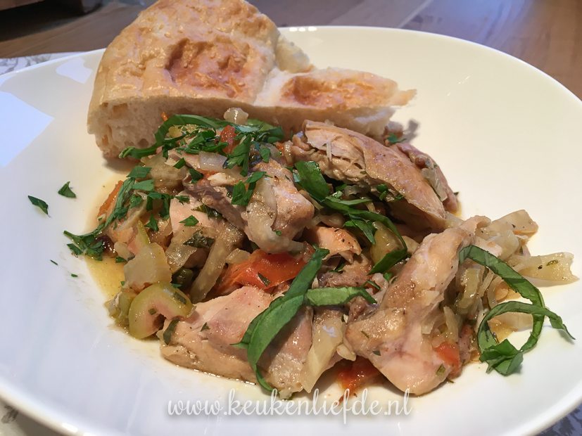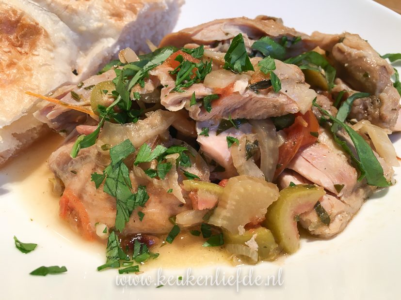 Na circa 3 uur stoven zijn de kippendijen boterzacht en vallen ze uit elkaar als je er licht op drukt. We serveren de kip met een lekker stuk Turks brood erbij. Godenmaaltijd!