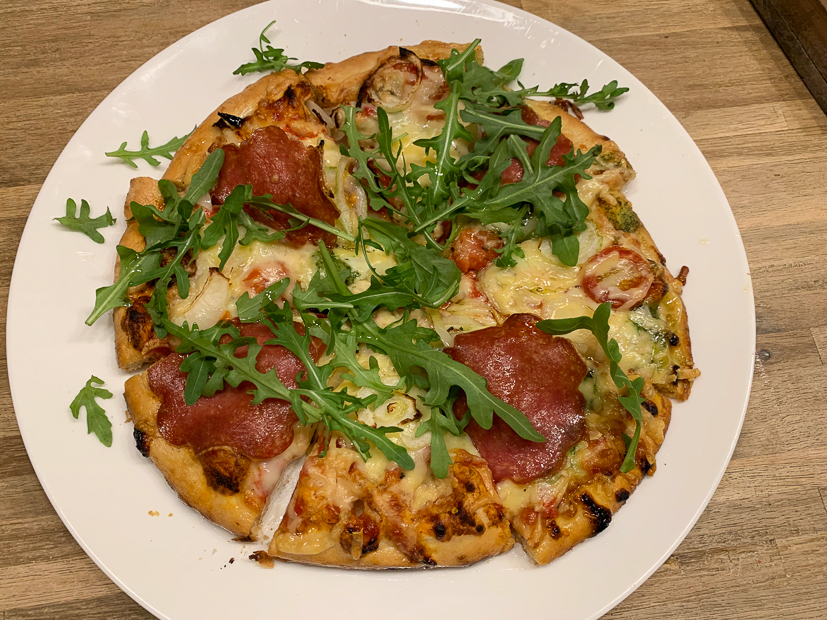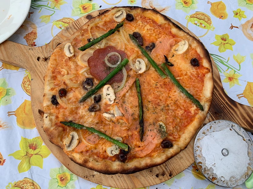 We bakten in totaal drie pizza’s die we allemaal verschillend belegden. De komende tijd gaan we flink oefenen met de Culina Flamma. Ik moet nog handigheid krijgen om de pizza voor het bakken op de pizzaschep te schuiven en er zijn nog wat andere dingetjes die we willen perfectioneren. Maar voor een eerste keer ging het al erg goed en de pizza’s smaakten heerlijk! Superknapperige korst en krokante bodem. Zelfs Ella-Marie die niet van pizza houdt heeft zitten smullen! Bovendien is het zo gezellig om op deze manier buiten te eten. Ik had ook nog shoarma, roerbakgroenten en pitabroodjes gehaald om bovenop de bakplaat te bakken maar uiteindelijk waren de pizza’s meer dan genoeg voor ons drieën. 🙂 Volgende keer gaan we ook de bakplaat bovenop uitproberen! Als we klaar zijn met eten trekken we de plaat aan de achterkant van de kacheldeur eruit en genieten we verder van het haardvuur. Love it!