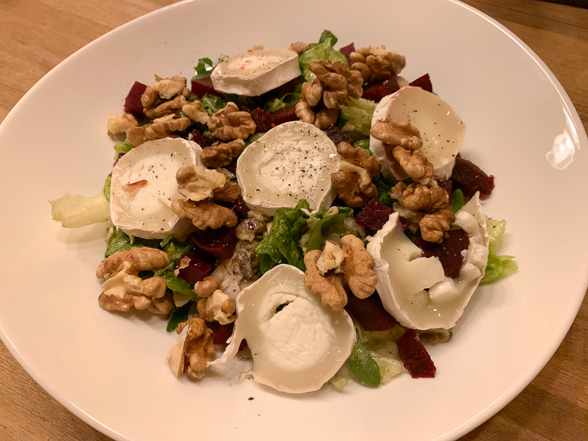 Ella-Marie had bij mijn schoonouders al meegegeten en als Ella ’s avonds op bed ligt eten Johan en ik een salade met bietjes, walnoten, zelfgemaakte walnotenpesto, en geitenkaas. Dit recept. Superlekker!
