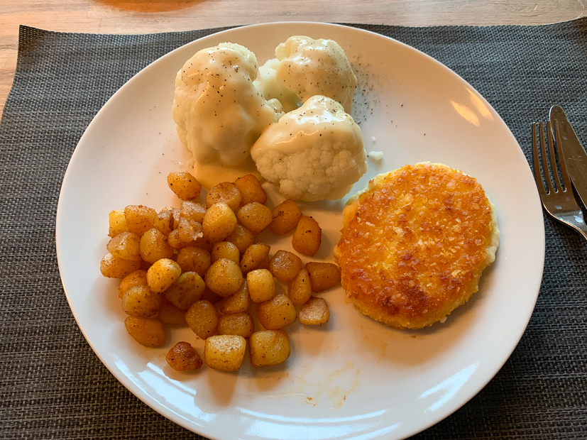 Manlief kookt het eten ’s avonds: gekookte bloemkool met een kaassausje, een kaasschnitzel (Haha, familie kaas hier!) en gebakken krieltjes. Ik had ’s ochtends alleen een beschuitje op met kaas en de rest van de dag niks meer dus dit smaakte me opperbest!