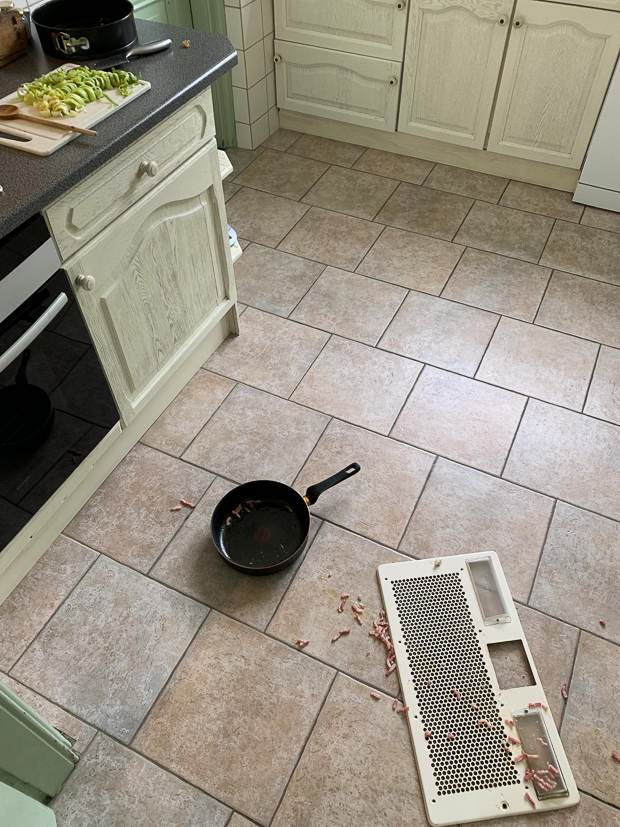 ’s Ochtends lig ik nog op de bank maar ’s middags hijs ik mezelf omhoog om een poging te wagen voor het avondeten. Na een blik in de koelkast besluit ik dat ik een quiche wil maken met spekjes, prei en nog wat restjes gekookte bloemkool van gisteren. Als ik de spekjes sta te bakken komt de kap van de afzuiger ineens naar beneden gevallen. Heb ik weer! Gelukkig had ik nog een pakje spekjes liggen dus nadat ik alles heb opgeruimd begin ik gewoon weer opnieuw.