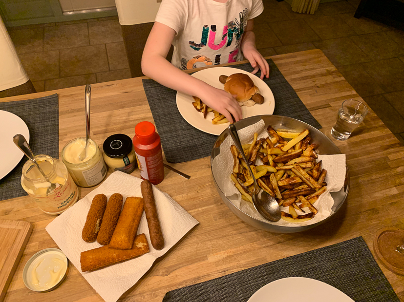 Als Johan ’s avonds thuis is steekt hij de pizzaoven aan zodat hij in kan branden. Ondertussen schillen we aardappels voor de zelfgemaakte ovenfrietjes. Die eten we vanavond weer met snacks uit de Airfryer.