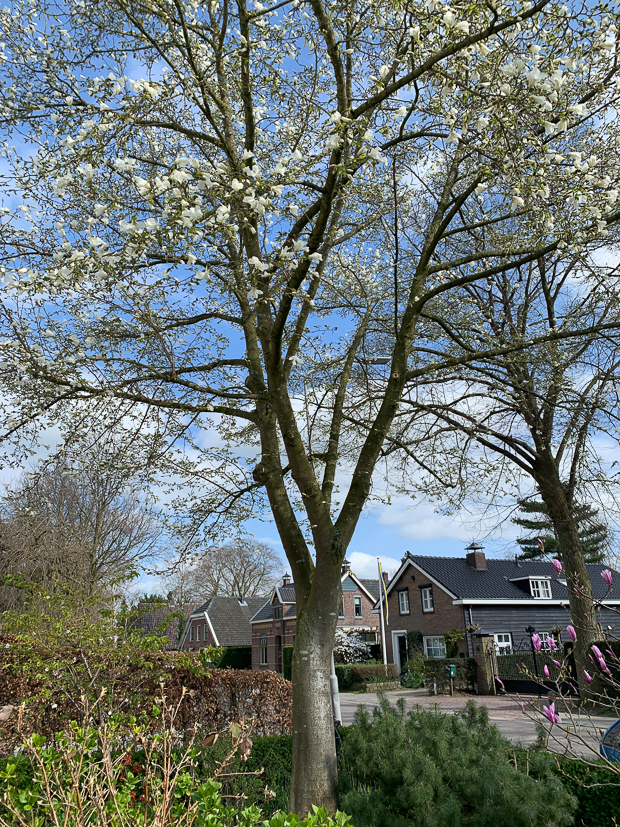 - Deze boom in onze voortuin zit vol met grote witte bloesem