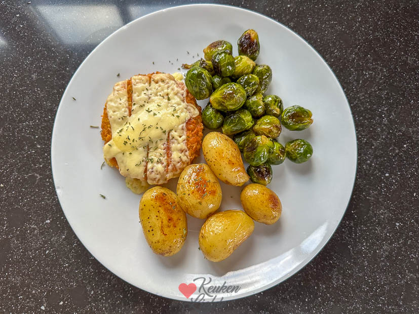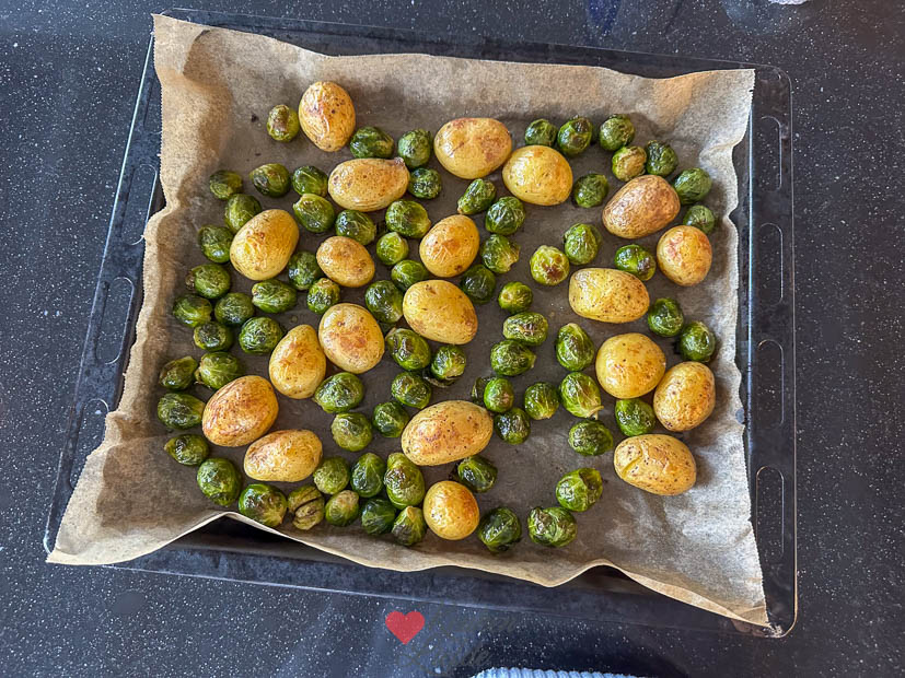 ’s Avonds maak ik een makkelijke maaltijd van het bakblik met spruitjes en krieltjes en in de airfryer bak ik er wat kipschnitzels bij. De krieltjes had ik eerst gaar gekookt en daarna samen met de spruitjes in de oven geroosterd. De spruitjes hoef je niet voor te koken.