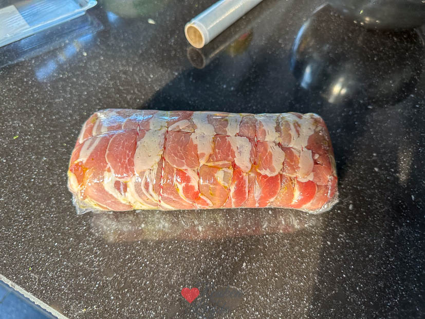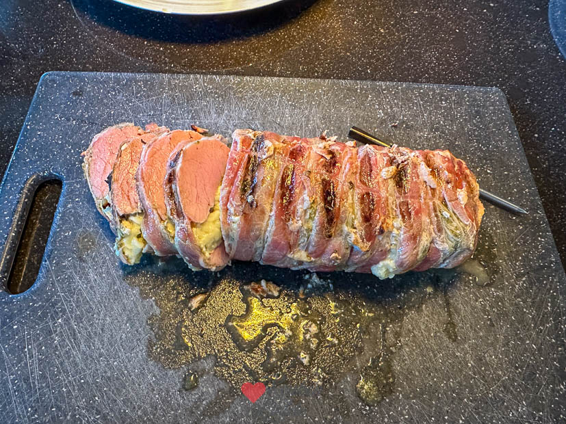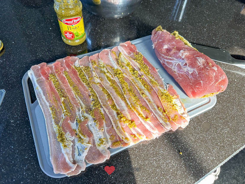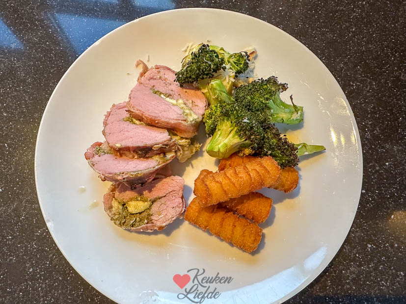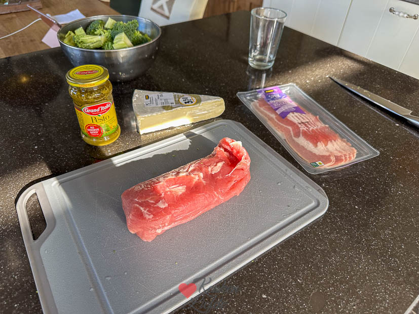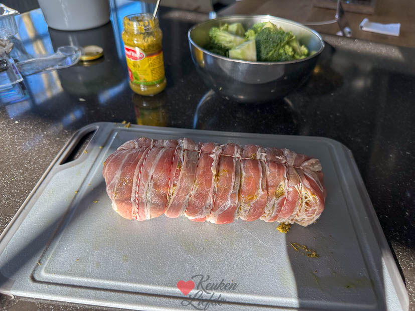 Op zaterdag maak ik altijd het huis schoon en haal ik de weekend boodschappen. Ondertussen is Johan boven weer aan het klussen. Eind van de middag bereid ik alvast het avondeten voor: ik vul een varkenshaasje met pesto en brie en omwikkel hem met spek. Daarna wikkel ik hem in vershoudfolie en bewaar hem in de koelkast. Johan bereid de varkenshaas ’s avonds indirect op de barbecue met broccoli en aardappelkroketjes erbij. Was heerlijk.
