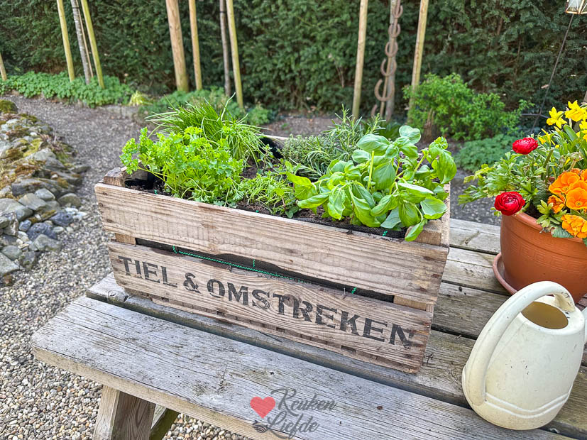 Als we weer thuis zijn vul ik het krat met worteldoek, potgrond en tuinkruiden. Ik heb groene en paarse basilicum, peterselie, oregano, tijm, rozemarijn, dille, bieslook en munt. Nu hopen dat ze aanslaan.