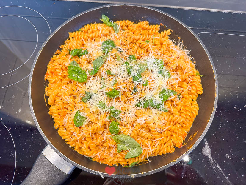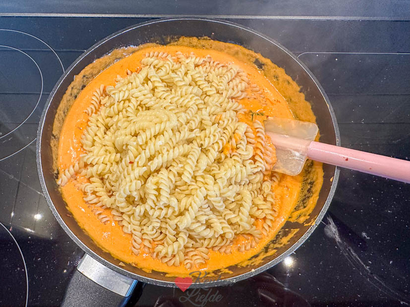 Ik had geen zin om boodschappen te doen en maak ’s avonds een makkelijke, goedkope en lekkere pasta met tomatenroomsaus. Dit recept.