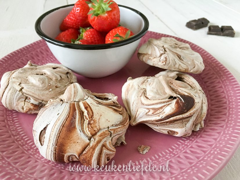 Ook maak ik foto’s van deze meringues met chocolade swirl die ik eerder al had gemaakt. In een goed afsluitbare diepvrieszak kun je meringues zeker een week bewaren, zonder dat ze zacht worden. Het recept ga ik binnenkort met je delen. Dit is trouwens mijn favoriete basisrecept voor meringue.