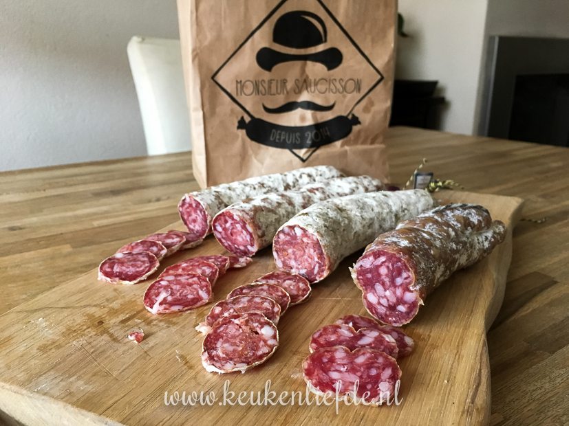 Ook krijg ik lekkere foodpost thuisbezorgd van Monsieur Saucisson. Je vindt ze in de Markthal in Rotterdam, maar je kunt de worsten ook online bestellen. Wij krijgen vier worsten in de smaken, vijg, eekhoorntjesbrood, lavendel en honing en blauwschimmelkaas. De eekhoorntjesbrood is mijn favoriet, maar eigenlijk zijn ze allemaal lekker!