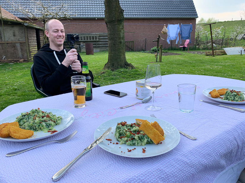 Voor het avondeten maakte ik rauwe andijviestamppot (dit is mijn favoriete recept) en serveerde er uitgebakken spekjes, een kaasschnitzel en een vegetarische schnitzel bij. Het was mooi weer dus we aten voor het eerst weer lekker buiten in de tuin!