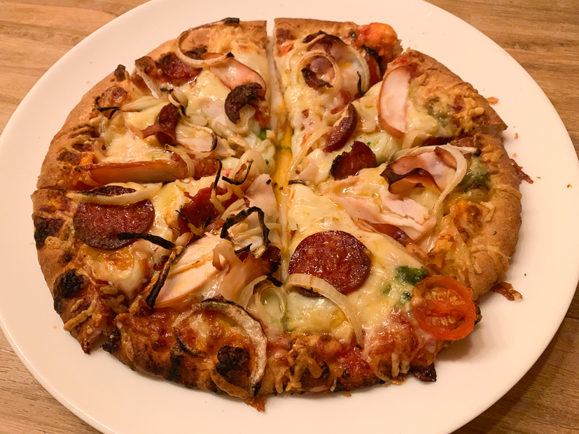 ’s Avonds heb ik geen puf meer om te koken en gooien we een diepvriespizza in de oven. Zoals altijd beleggen we die extra met van alles wat we in de koelkast vinden.