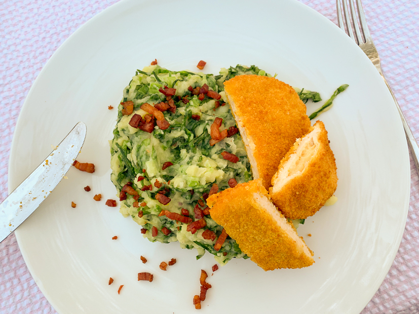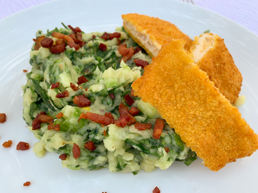 - Opgebakken andijviestamppot met gebakken ei met spek en kaas en knakworstjes voor Johan