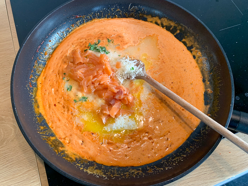 1 gesnipperd uitje, 2 uitgeperste knoflooktenen en gedroogde chilivlokken zacht fruiten. Ondertussen 300 g pasta naar keuze beetgaar koken (mok kookvocht opvangen), afspoelen met koud water en laten uitlekken. Uitje afblussen met scheut wodka (citroensap kan ook) en 70 g tomatenpuree erbij. Even meebakken. Dan 250 ml room en wat fijngesneden basilicum erbij. Aan de kook brengen en vuur dan lager zetten. Saus op smaak brengen met zout en peper uit de molen en eventueel snufje suiker en azijn (gelijke delen). Dan scheut kookvocht, flinke hand geraspte parmezaan, klontje roomboter, pasta en zalm door de saus roeren en goed doorwarmen. Als de saus te dik is kun je wat meer kookvocht toevoegen. Voor 3 personen. Als je hem zoals ik met risoni (pasta in korrelvorm) maakt krijg je een soort risotto idee.