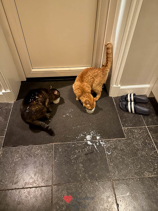 - De katten zijn zo dol op kattenmelk dat je niet eens rustig de bakjes neer kunt zetten…. 😂