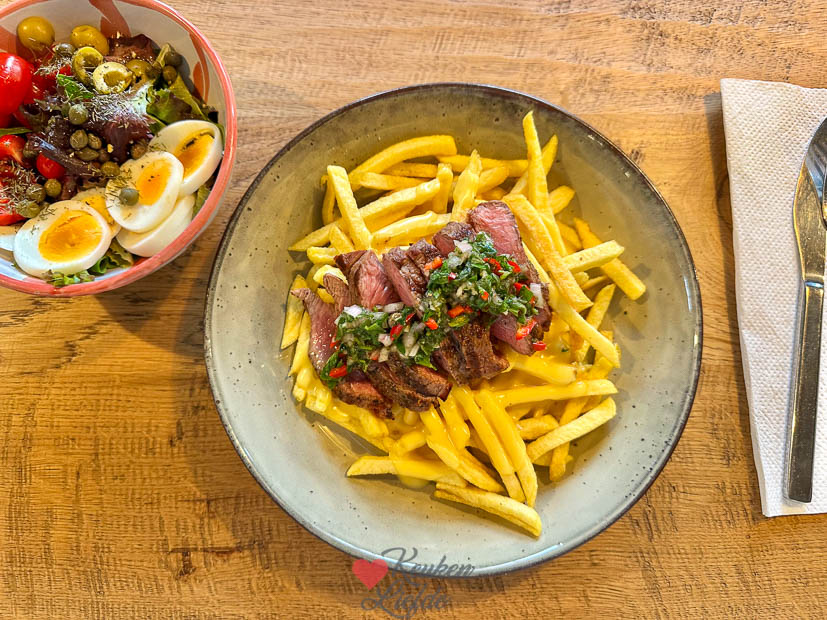 ’s Avonds kookt Johan een lekker maaltje dat hij op social media ergens voorbij had zien komen: frietjes overgoten met kaassaus, belegd met diamanthaas van het ei en chimichurri. Van dat laatste heb ik nog geen recept op KL ontdekte ik dus daar ga ik binnenkort maar eens mee aan de slag. En erbij had Johan voor iedereen een saladebakje gemaakt. Smullen!