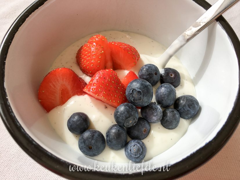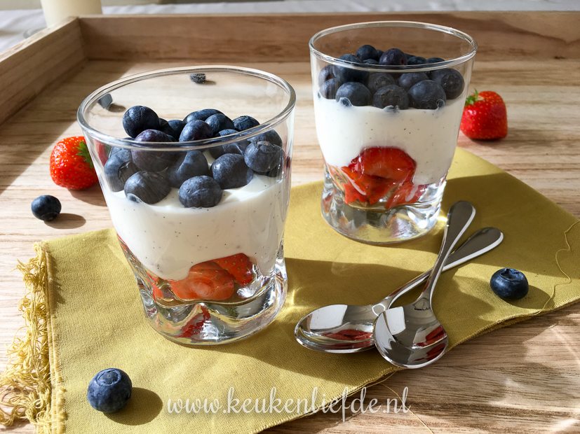 - Zelfgemaakte vanillekwark met aardbei en blauwe bes