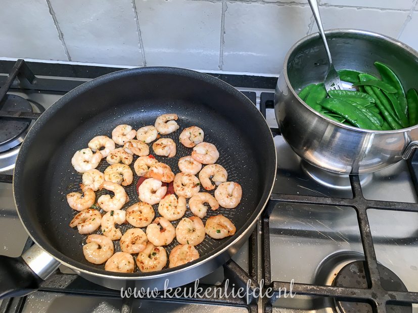 - Knoflookgarnalen bakken. De peulen zijn al gekookt om omgezwenkt met zelfgemaakte kruidenboter