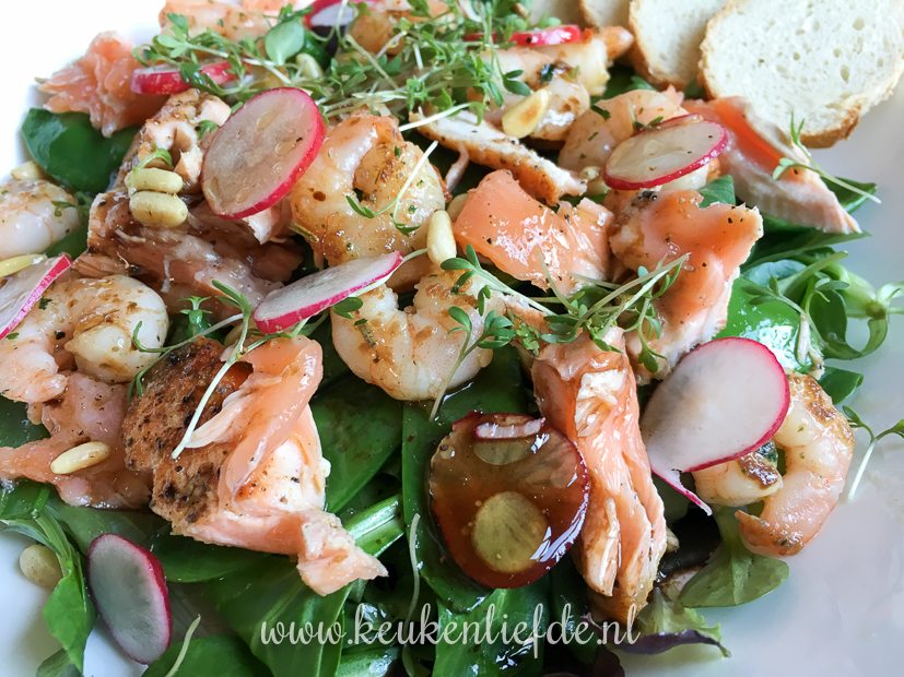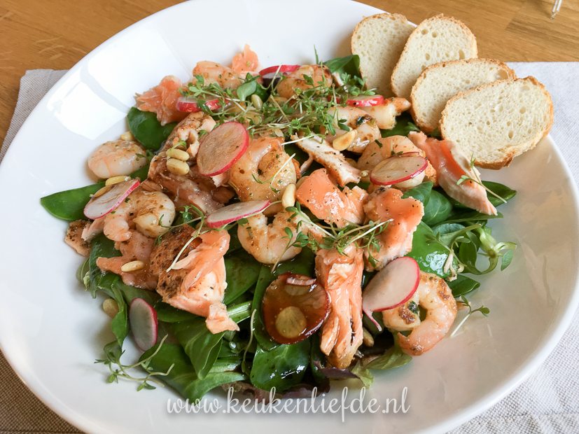 Ik maak ’s avonds een lekkere salade met gebakken zalm, knoflookgarnalen en peulen. Momenteel het favoriete avondmaaltje van Ella-Marie!