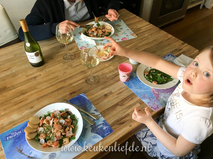 - Terwijl ik foto’s aan het maken ben van mijn bord eten, zit Ella-Marie de zalm van haar salade al op te peuzelen…