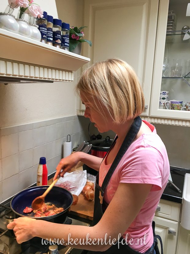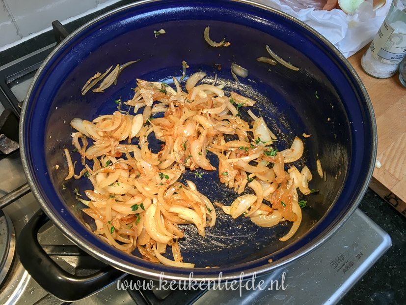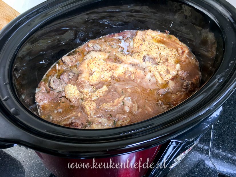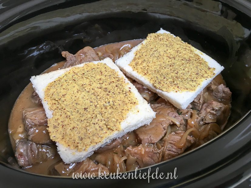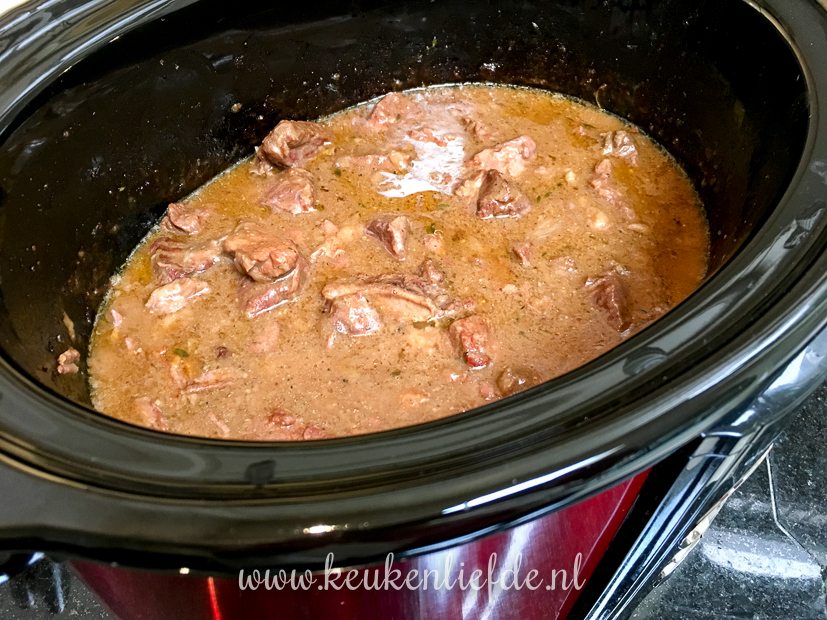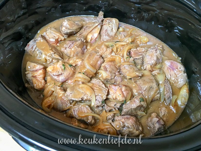 - Het vlees en uiensaus met bier en fond gaan bij elkaar in de slowcooker