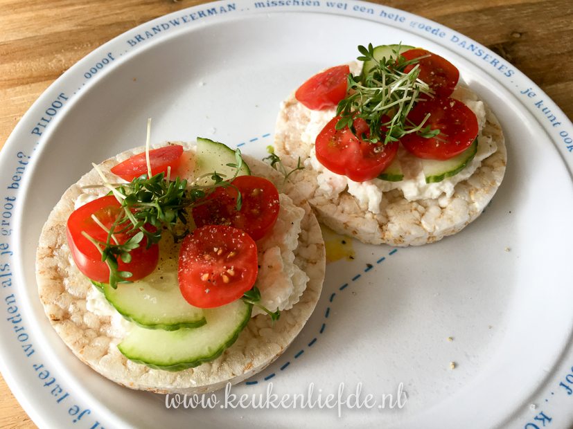 Door alle taartjes en andere zoete lekkernijen van de afgelopen tijd ben ik ongemerkt een paar pondjes aangekomen. Tijd om de broekriem weer aan te trekken dus! Na alle eierbakjes met zalm, crème fraîche en soldaatje, roombotercroissantsmet jam, geroosterd brood met gezouten roomboter en kaas en taart is het nu tijd voor rijstwafels met Hüttenkäse, komkommer, tomaat en tuinkers. Stiekem geniet ik daar (bijna) net zoveel van.