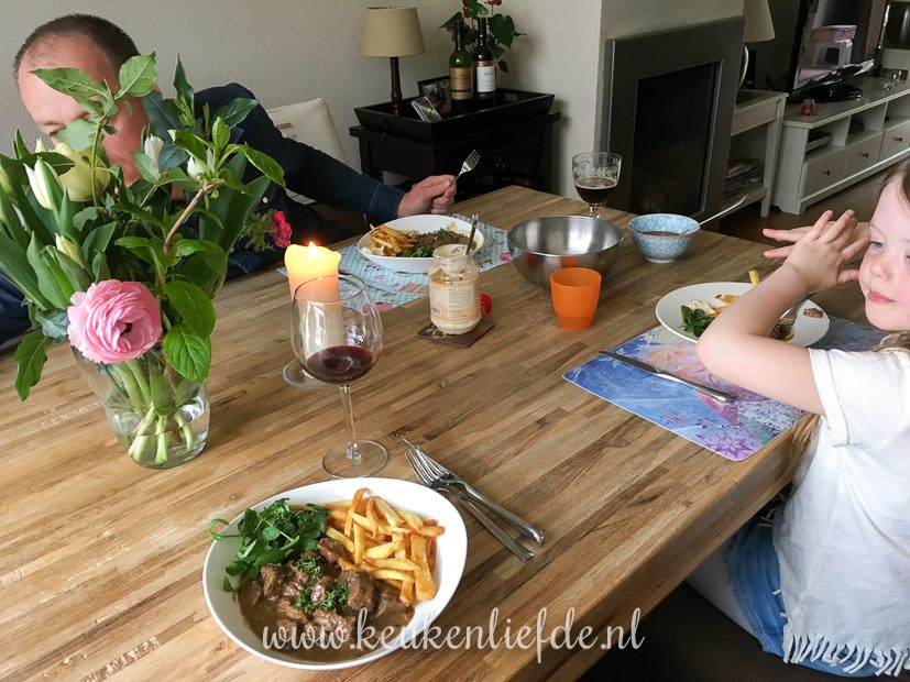 ’s Middags komt ons moppie weer thuis van haar logeerpartijtje bij mijn schoonouders en de rest van de middag hangen we een beetje lui op de bank. Er is nog stoofvlees over van gisteren dus vanavond eten we weer stoofvlees met zelfgemaakte frieten!
