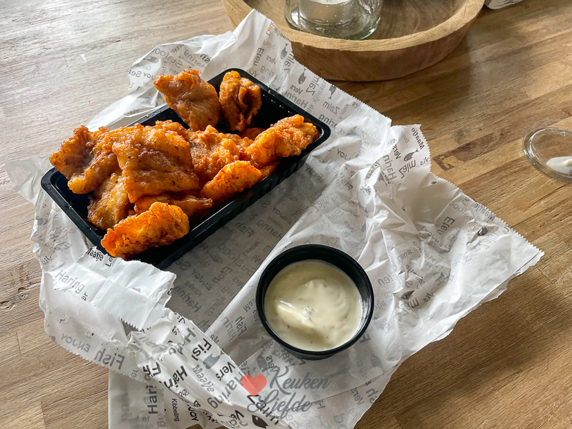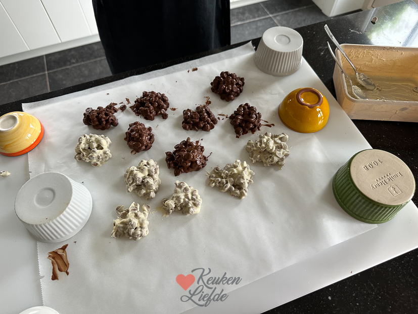 Iedereen is thuis vandaag en we rommelen wat aan. Er worden schuddebuikjes-chocoladerotsjes gemaakt en ’s middags gaan Johan en ik op pad om boodschappen te doen. Op de terugweg naar huis halen we een bakje kibbeling om thuis op te eten. Bij de landwinkel hadden we verse asperges en krieltjes gehaald voor het avondeten dus na de kibbeling ging ik even zitten om te schillen.
