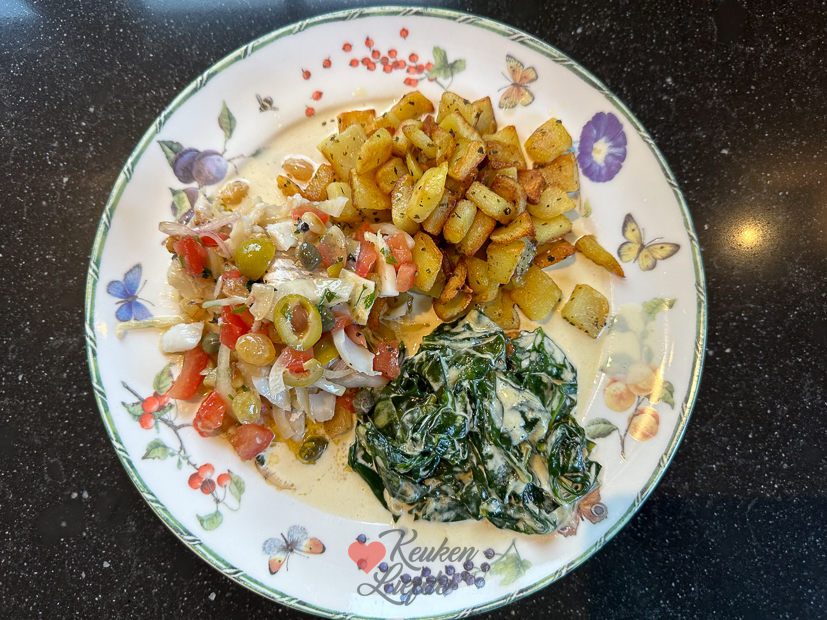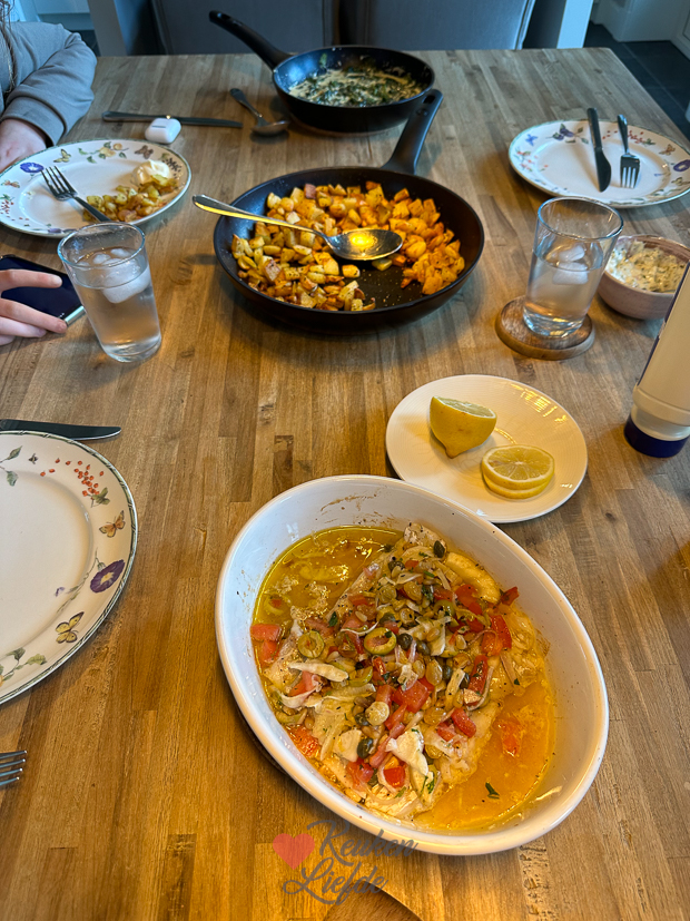 Voor het avondeten keek ik in de koelkast en zo stond er niet veel later een lekker mengelmoesje op tafel: gebakken aardappeltjes, verse spinazie à la crème en kabeljauw uit de oven met tomaat-venkeltopping (van dit recept). Eind van de middag was Ella ook weer thuis dus we aten gezellig met z’n allen.