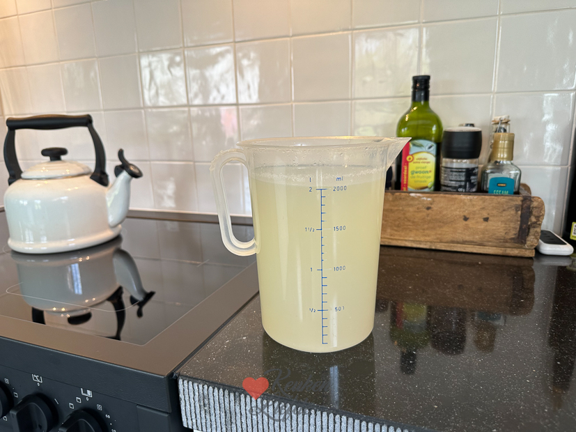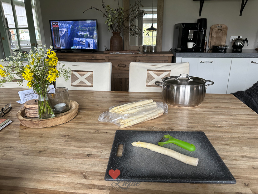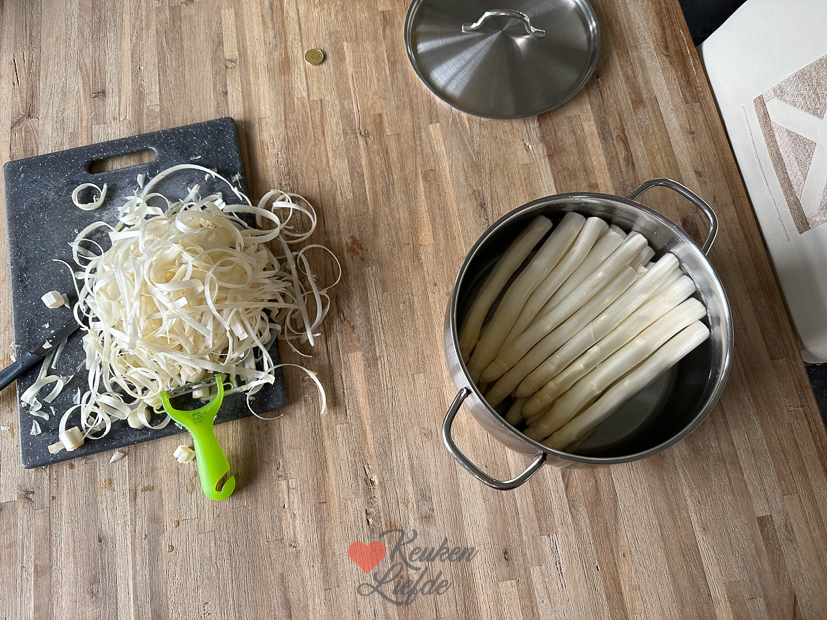 - De aspergeschillen bewaar ik en voeg ik na het koken van de asperges toe aan het kookvocht en kook het nog een keer. Zo krijg je een lekkere aspergebouillon voor soep