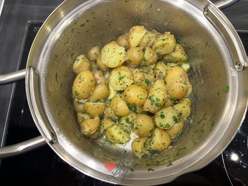 - Krieltjes omgehusseld met roomboter, peterselie en bieslook en een draai zeezout