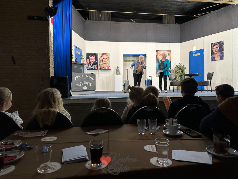 Het aspergekookvocht met de schillen had ik gisteren na het koken laten afkoelen en bewaard in de koelkast. Nu voeg ik daar 2 kipfilets, een laurierblaadje en wat foelie aan toe en breng het nog een keer aan de kook tot de kip gaar is. Dan haal ik de kip eruit en laat de bouillon weer afkoelen. Ik trek de kip uit elkaar en snijd een wortel fijn. Vanavond maak ik deze koninginnensoep voor het avondeten met de aspergebouillon. Omdat ik 2 liter bouillon had verdubbelde ik het recept behalve de bouillonblokjes. Daar gebruikte ik er 3 van. ’s Avonds eten we de koninginnensoep met brood. Daarna kleden we ons om en gaan we bij de toneeluitvoering kijken waar Johan zijn moeder in meespeelt. Weer erg gelachen.