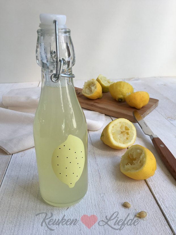 Omdat het zo warm is en omdat ik een fruitmand vol heb liggen met citroenen besluit ik na de kookboekgerechten ook maar meteen een flesje citroenlimonade te maken. Het recept staat al online en vind je hier. Aangelengd met ijsblokjes en water een perfect, verkoelend zomerdrankje! Ella-Marie is hier dol op.