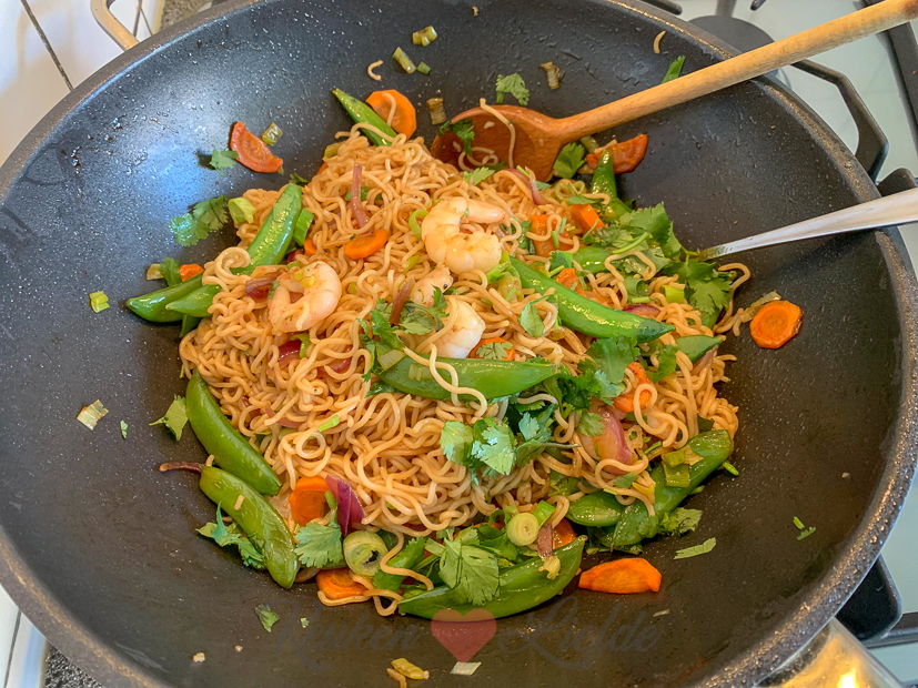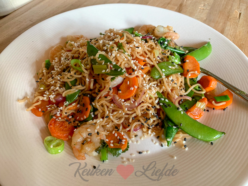 Vandaag op het menu: roerbaknoedels met sugar snaps, wortel, rode ui en knoflookgarnalen in een zelfgemaakte woksausje van oestersaus, sojasaus, rijstazijn en een druppel sesamolie. Echt een van mijn favoriete gerechten als ik weinig tijd heb om te koken maar toch lekker en gezond wil eten.