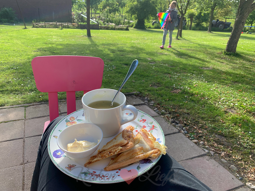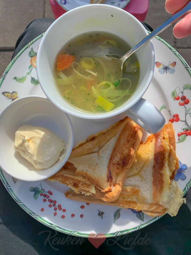 We werken de hele dag in de tuin en eten daarom makkelijk ’s avonds: kippensoep (uit een zakje) met verse wortel en prei en een tosti.