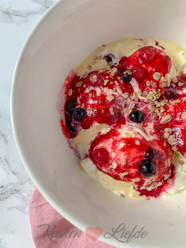 Na het eten maakt Ella-Marie een toetje voor zichzelf met ijs en bosvruchtensaus. Voordat ze het opeet moet het natuurlijk eerst even op de foto… #minime #minichef #foodbloggerinwording