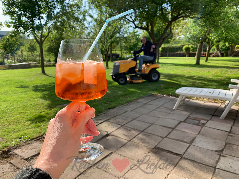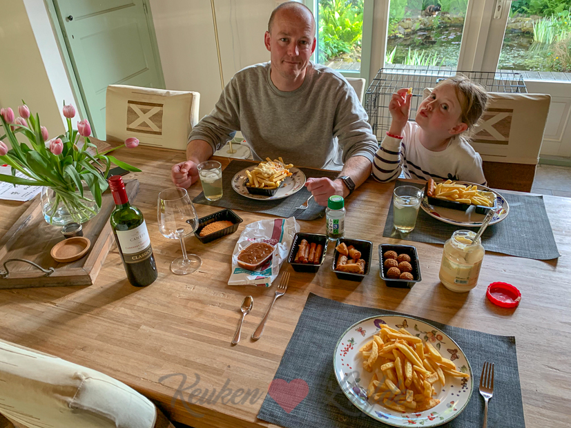 Om zes uur ’s avonds ben ik klaar met het opruimen van de keuken en kan ik buiten nog even genieten van het zonnetje. Ondertussen maait Johan en gras en springt Ella-Marie op de trampoline. Ik kan even geen Indisch eten meer zien en dus halen we ’s avonds een frietje.