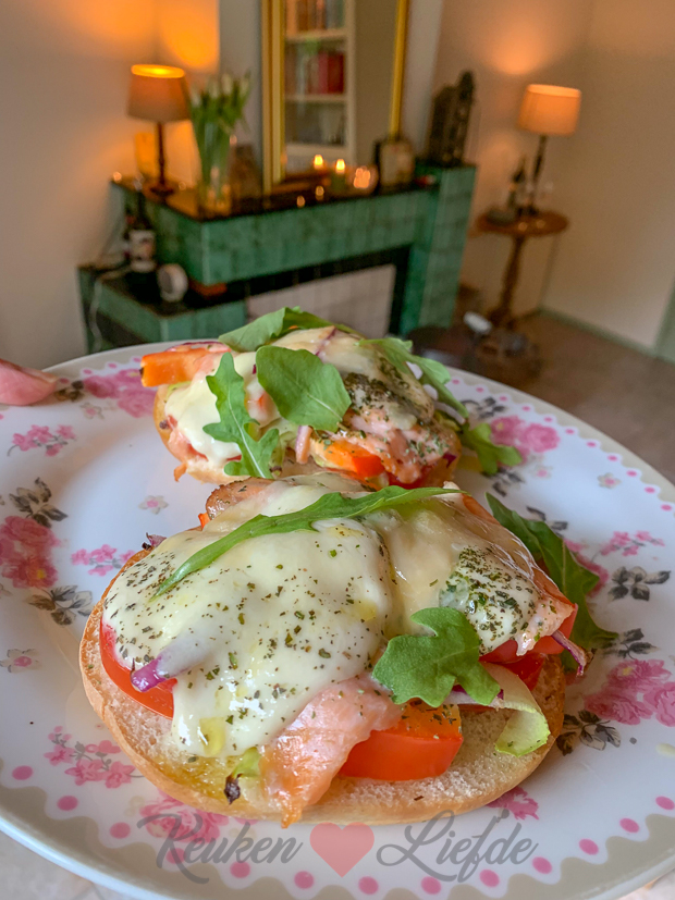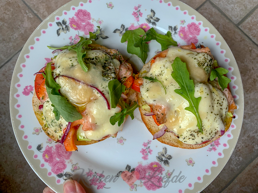 ’s Avonds eten we mini Turkse broodjes die we opensnijden, beleggen met onder andere zalm, tomaat, mozzarella en paprika en even afbakken in de oven.