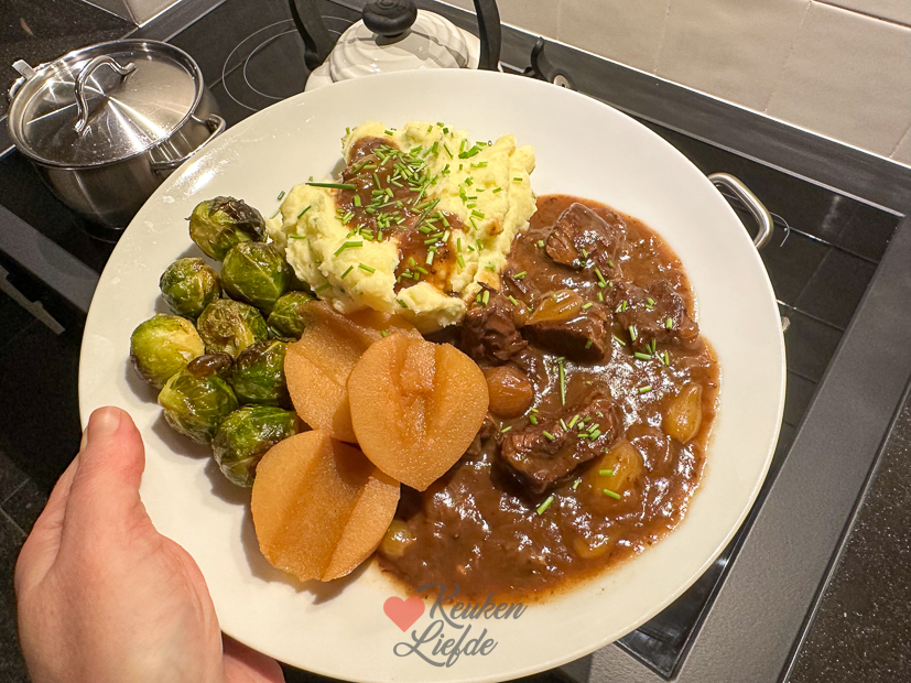 Vandaag is ook weer een enerverende dag in huize Verweij. Johan reed een paar keer op en neer naar de stort en de bouwmarkt. Ik stond natuurlijk in de keuken. Gisteren had ik riblappen en stoofperen in de aanbieding gekocht dus vanavond eten we stoofvlees. Dat maak ik tegenwoordig altijd in de slowcooker. Ik bak eerst alle ingrediënten (vlees, uien, knofook) aan in de koekenpan, verwarm het bier, de fond en de appelstroop in de koekenpan en gooi daarna alles in de slowcooker. Ongeveer dit recept maar dan met 2 eetlepels appel-perenstroop, een eetlepel azijn en zilveruitjes erbij. Na uren sudderen in de slome is het vlees boterzacht. De stoofperen gaan in een pan met water (rode wijn, glühwein of port kan ook), donkerbruine basterdsuiker, een steranijs en een kaneelstokje. Erbij maak ik aardappelpuree en spruitjes. De spruitjes rooster ik op het bakblik in de oven, omgehusseld met wat olijfolie en een draai zeezout. Ongeveer 20 minuten op 200 graden, tot ze gaar zijn. Mijn favoriete manier om spruitjes te bereiden tegenwoordig. Zo lekker!