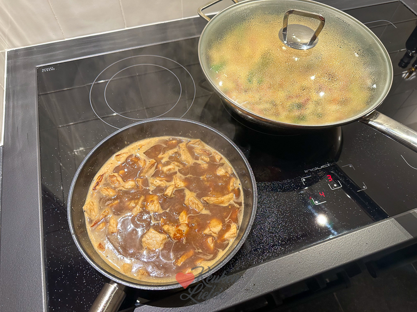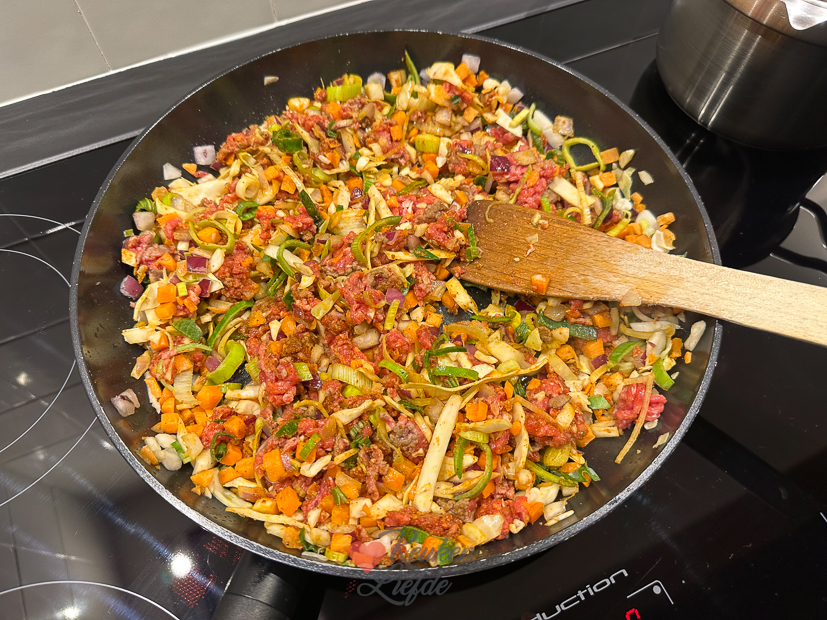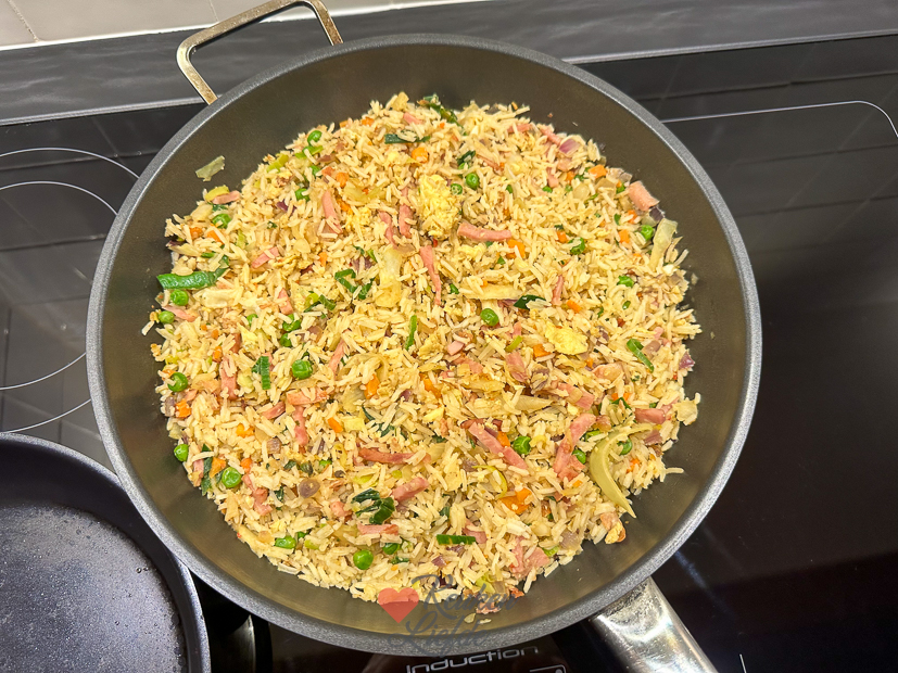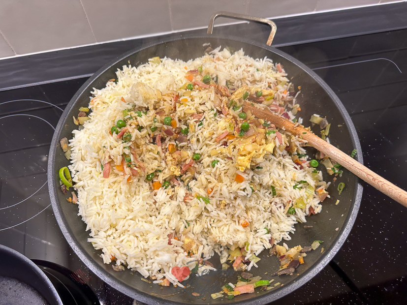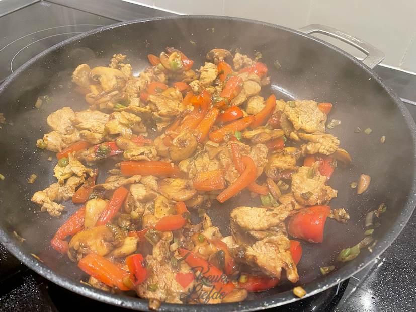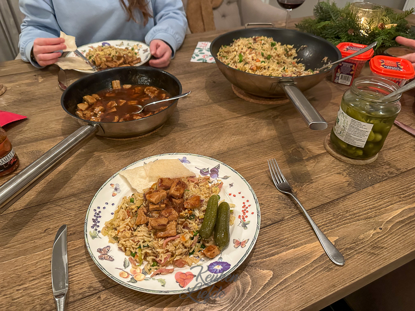 De vakantie is weer voorbij. Voor Johan gaat de wekker al heel vroeg, hij moet weer werken vandaag. Ella is vandaag nog vrij en hoeft morgen pas naar school. Ik sta ook weer vroeg op om een artikel online te zetten, mailtjes te beantwoorden en nieuwe recepten te bedenken voor de kookdagen deze week. ’s Middags haal ik boodschappen voor het avondeten en alvast voor de eerste kookdag. Ik heb 3 weken niet voor KL gekookt en heb weer zin om aan de slag te gaan. Ik heb zoveel leuke nieuwe recepten bedacht en ik popel om ze te maken en ze met je te delen. Ella gaat ’s middags een wandeling maken met Nacho en komt midden in een flinke bui terecht. Jakkes! Als ze thuiskomen pak ik een handdoek om Nacho af te drogen en stapt Ella onder een warme douche. Ondertussen ga ik de keuken in om alvast met het avondeten te beginnen. Op het menu vanavond staat nasi goreng met babi ketjap.