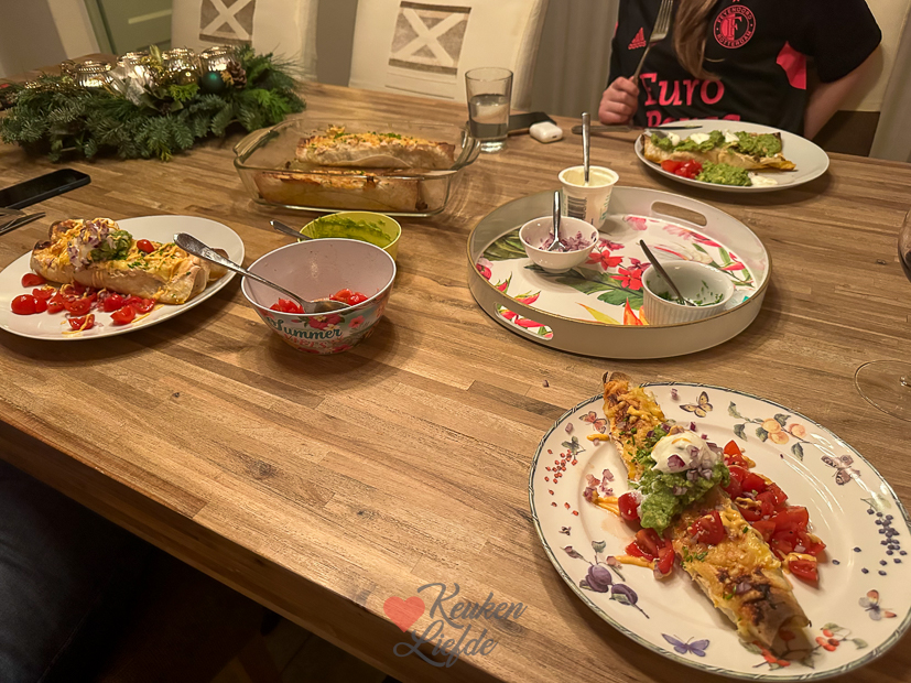 Vandaag ruimen we de kerstspullen weer op. Ik hou enorm van de sfeer en gezelligheid die kerst met zich meebrengt, maar in januari vind ik het ook wel weer fijn om alles op te ruimen en schoon te maken. Voor het avondeten maakte ik burrito’s met gehakt en groenten en serveerde ze met guacamole, sriracho mayonaise, zure room, tomatensalsa en rode ui.